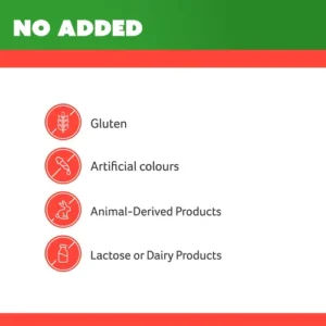 No added gluten, lactose, artificial colours, dairy products or animal derived products.