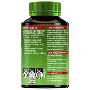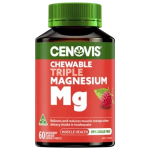 Cenovis® Chewable Triple Magnesium Mg gives you three types of magnesium in one great-tasting raspberry flavoured chewable tablet — that’s 99% sugar free.