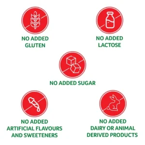 No added gluten, lactose, sugar, artificial flavours, artificial sweeteners, dairy products or animal-derived products.
