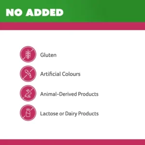 No added gluten, lactose, artificial colours, dairy products or animal-derived products.