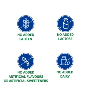 No added gluten, lactose, artificial flavours, artificial sweeteners or dairy products.