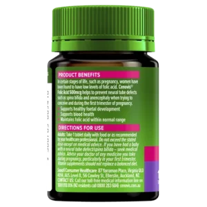 Cenovis® Folic Acid 500mcg helps prevent neural tube defects like spina bifida when taken before and during early pregnancy. It helps support healthy foetal brain development when your little one is just getting started. For adults, it maintains healthy folic acid levels and assists healthy red blood cell production.